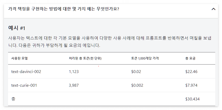가격은 토큰 기반 가격 모델로 토큰 1000개당 가격이 $0.02로 계산되고 있습니다. 또한 모델이 복잡할수록 가격이 높아지니 이에 대한 자세한 내용은 다음 링크를 살펴보면 좋을 거 같습니다.