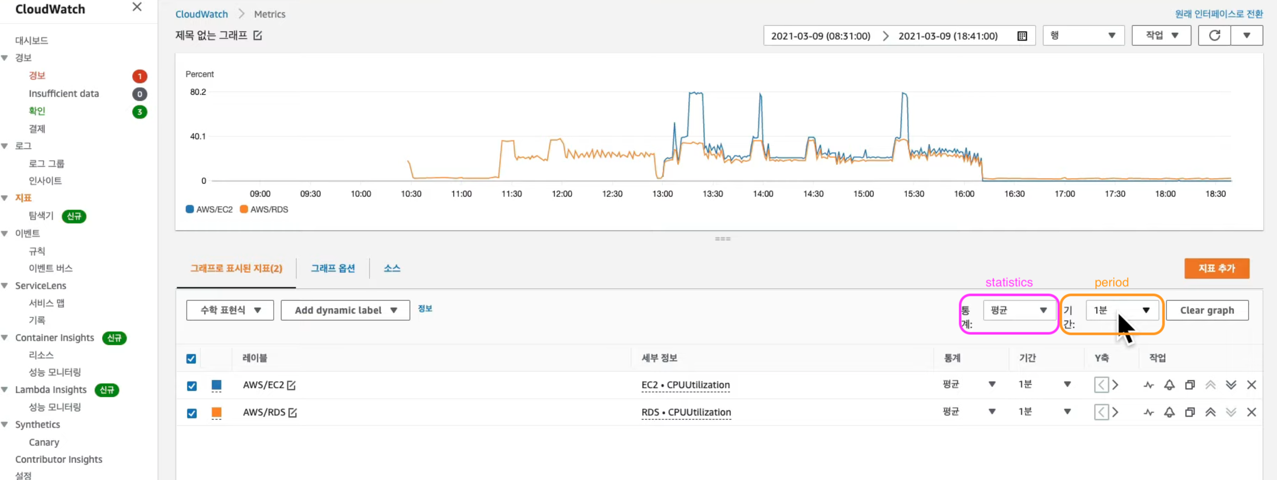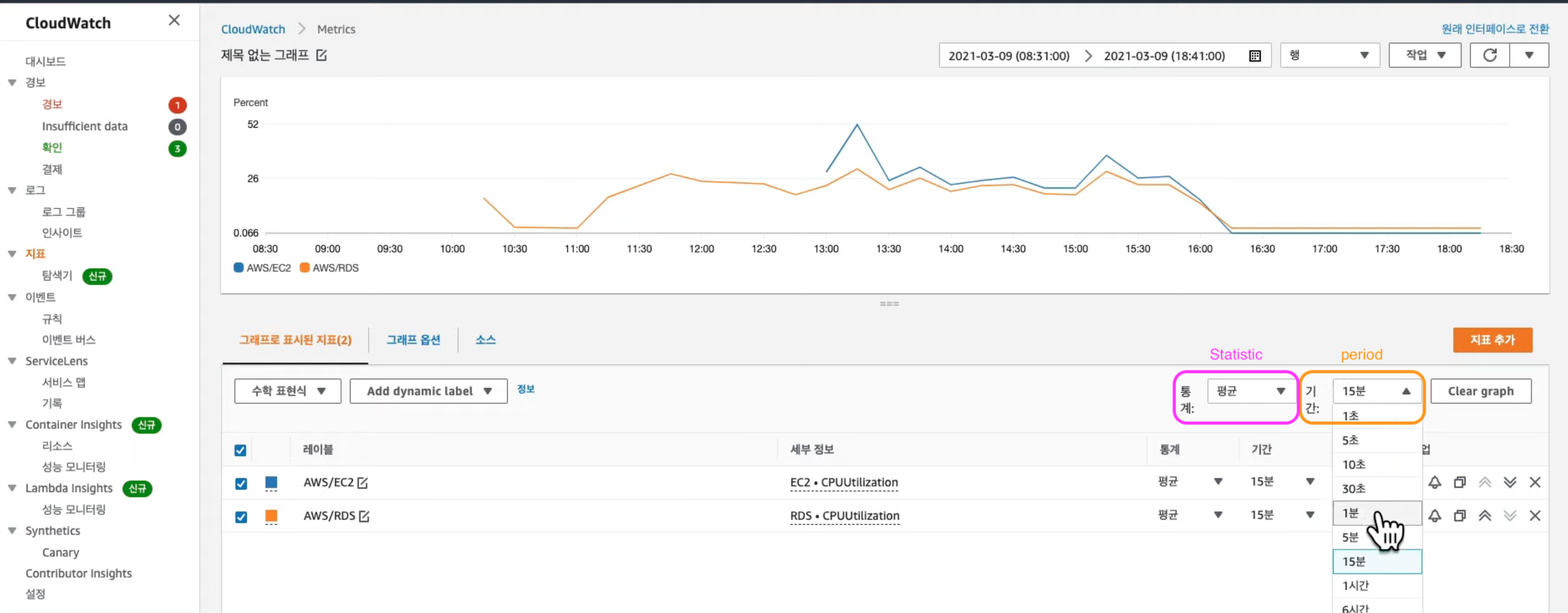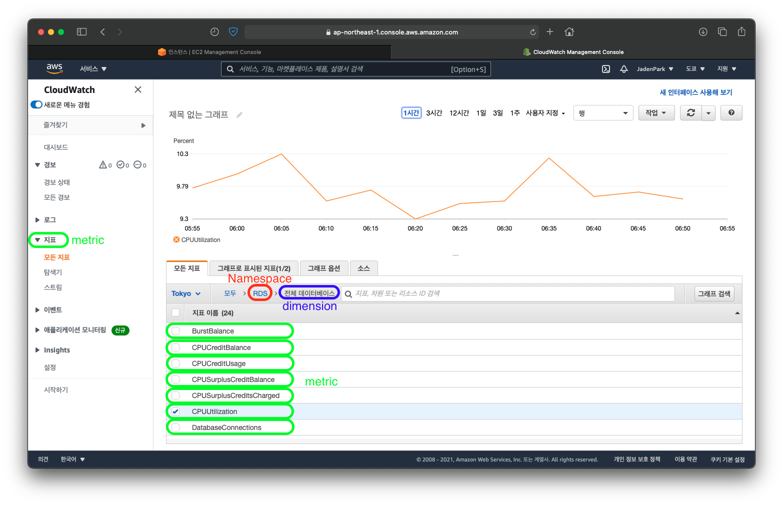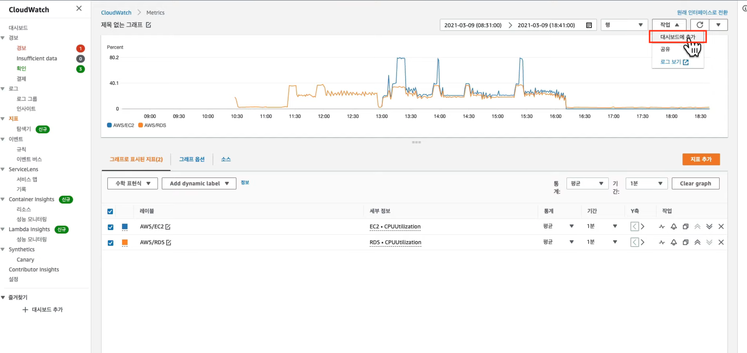 "RDS 인스턴스의 CPU 점유율을 보고 싶다." 라고 하면.