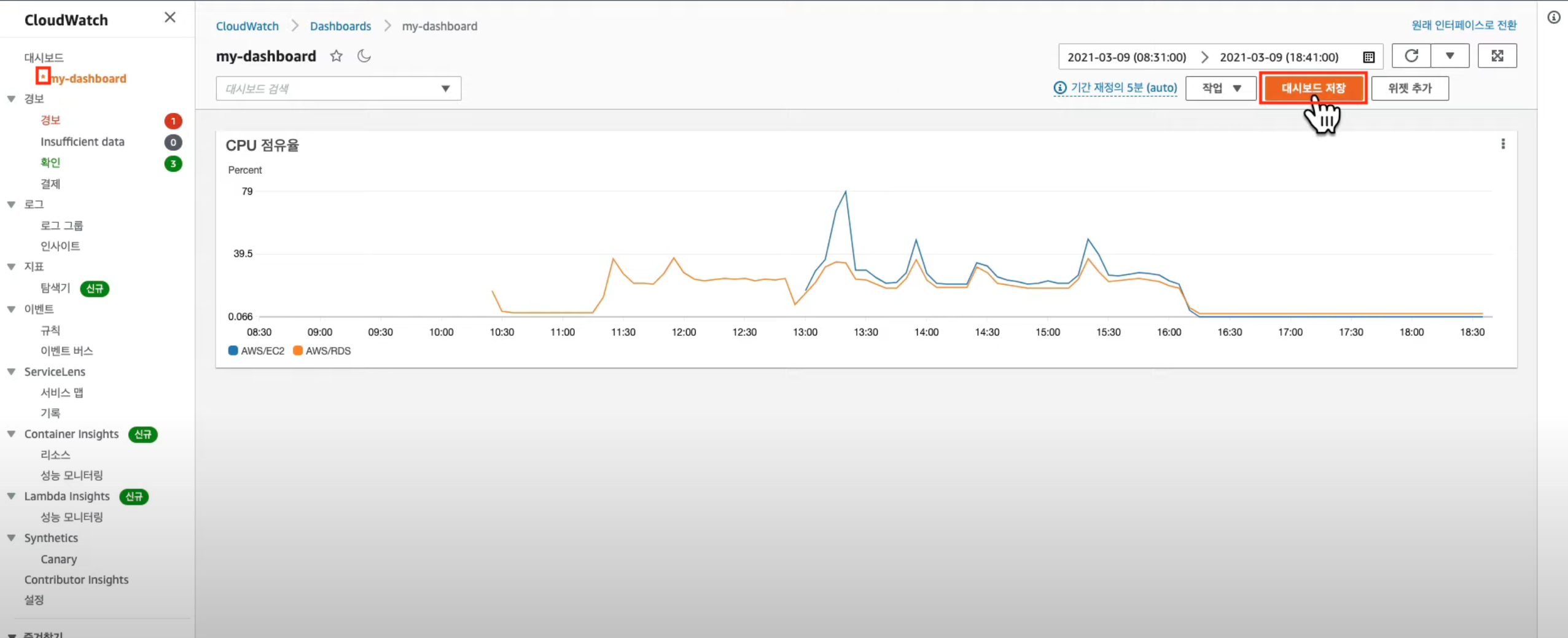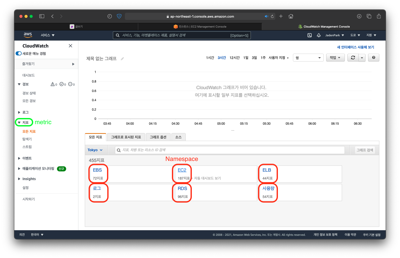 AWS cloudwatch 서비스 탭에서 확인