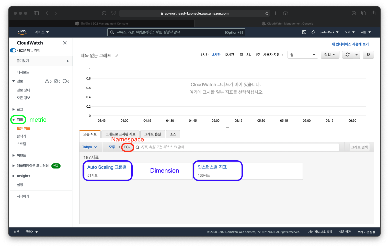 CloudWatch 탭에서 지표를 클릭했을 때
