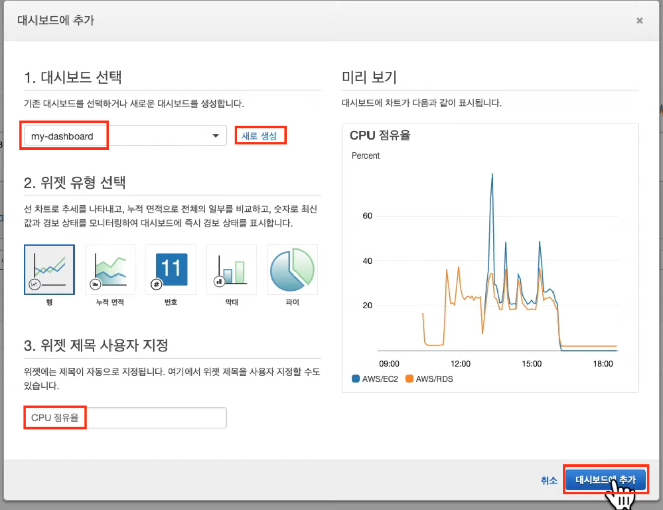 대시보드 선택: my-dashboard [새로 생성 클릭](기존 대시보드가 있을 경우 기존 대시보드를 해주세요)