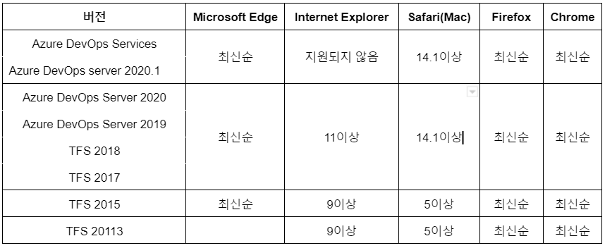 Microsoft Edge, Firefox 및 Chrome은 자동으로 업데이트되므로 Azure DevOps 최신 버전을 지원합니다.