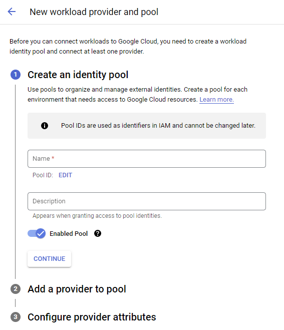 - 일반적으로 개발, 스테이징, 프로덕션 환경과 같은 Google Cloud 리소스에 액세스해야 하는 Google Cloud 이외의 환경마다 새로운 Pool을 만드는 것이 좋습니다.