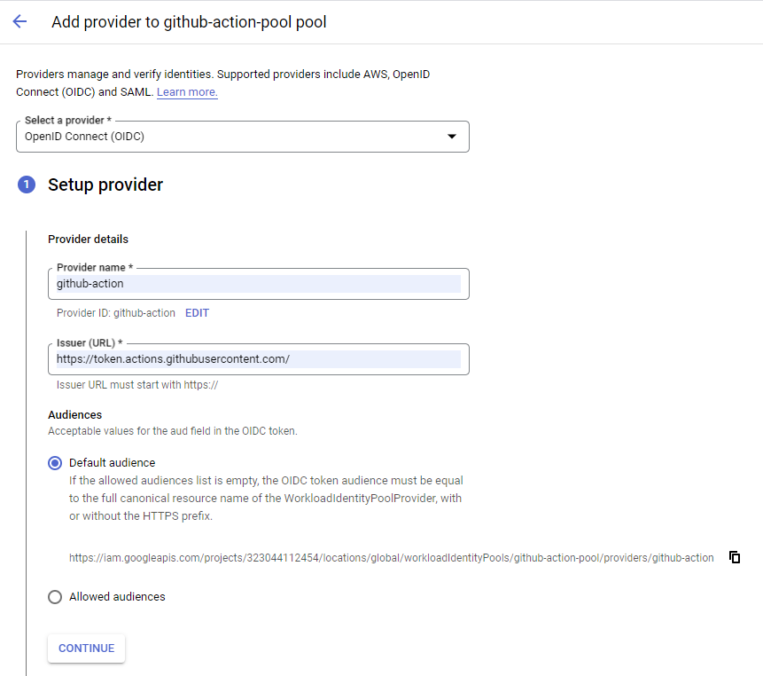 - Workload Identity Provider 설정 시 github action에서 적용되는 OIDC 인증을 위한Token 발행 issuer URL