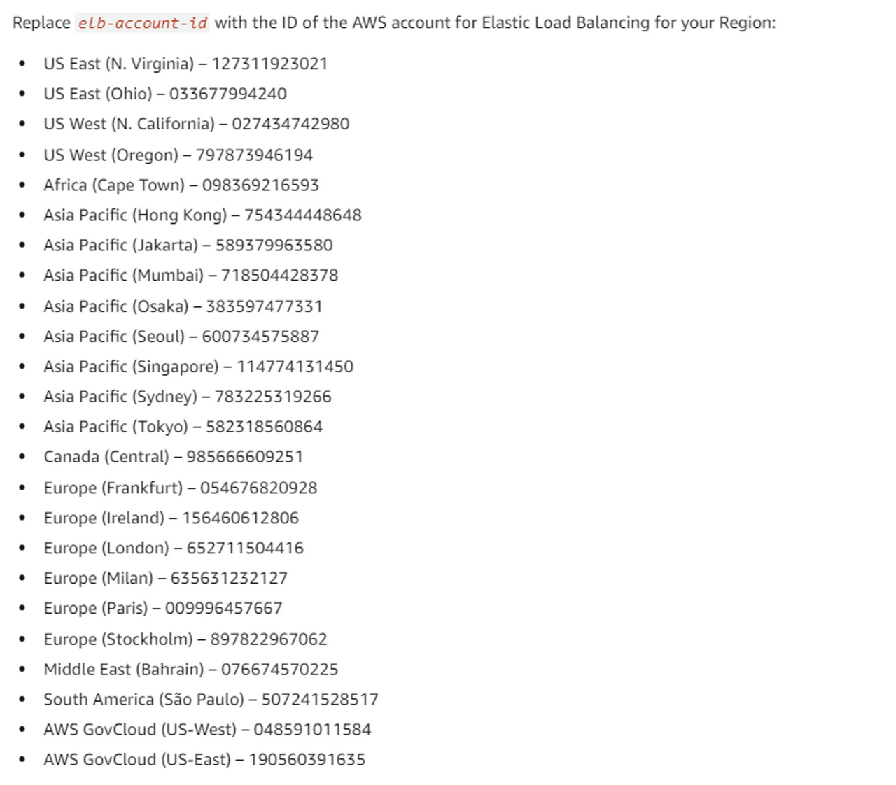 "AWS": "arn:aws:iam::elb-account-id:root"