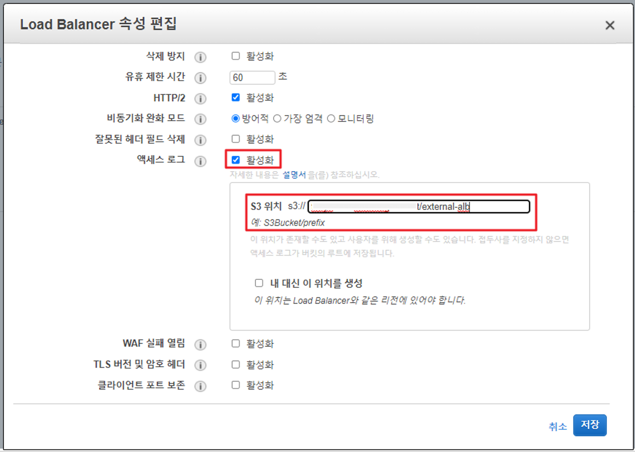 - 위의 사진 속에 속성 편집을 클릭하여 엑세스 로그를 활성화 해주고 앞서 생성한 s3 버킷을 지정해줍니다.