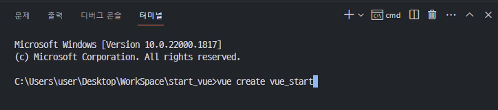 3. Command Prompt 터미널을 열고 프로젝트 생성을 위해 vue create <vue 프로젝트명> 을 입력