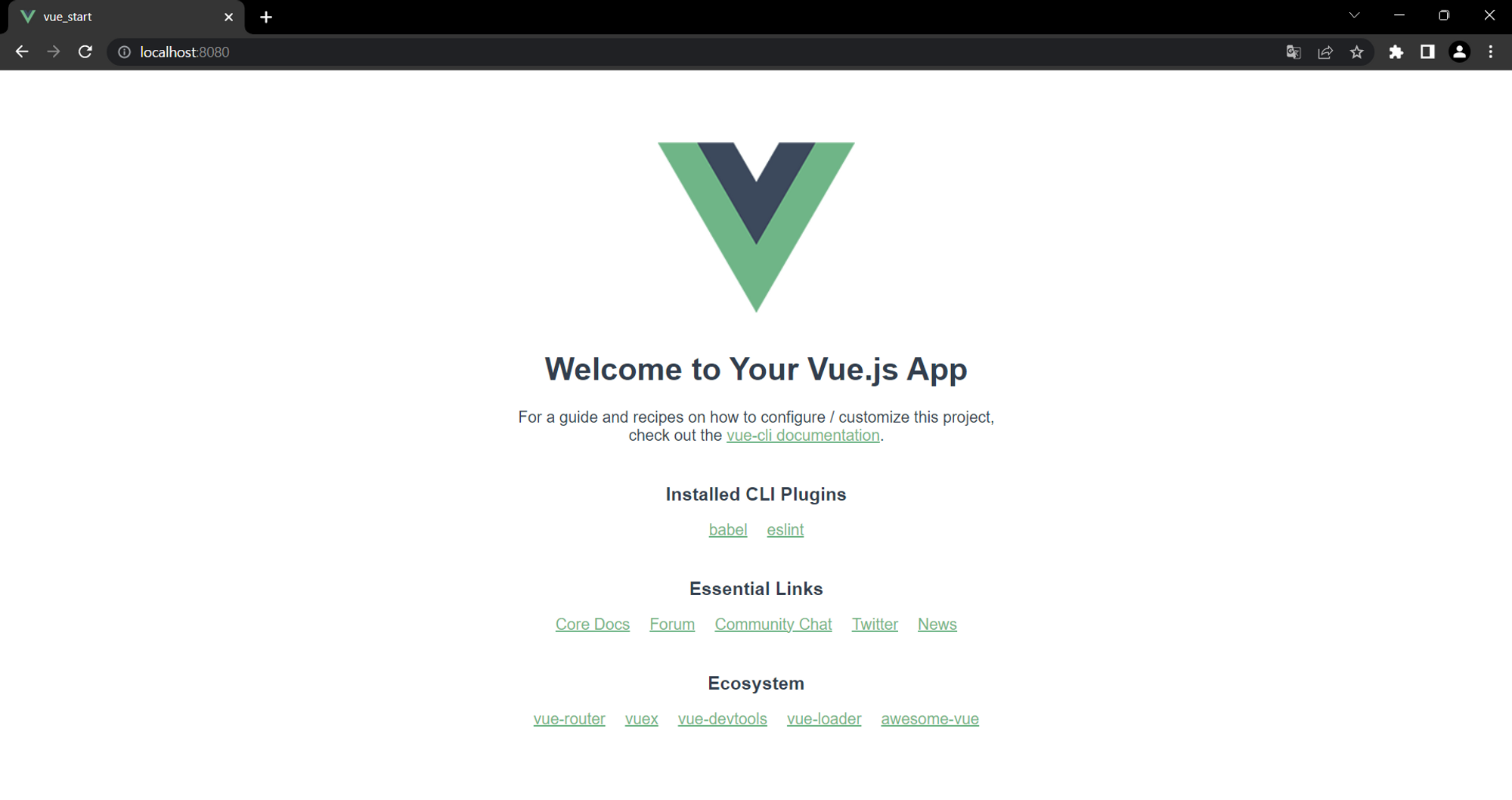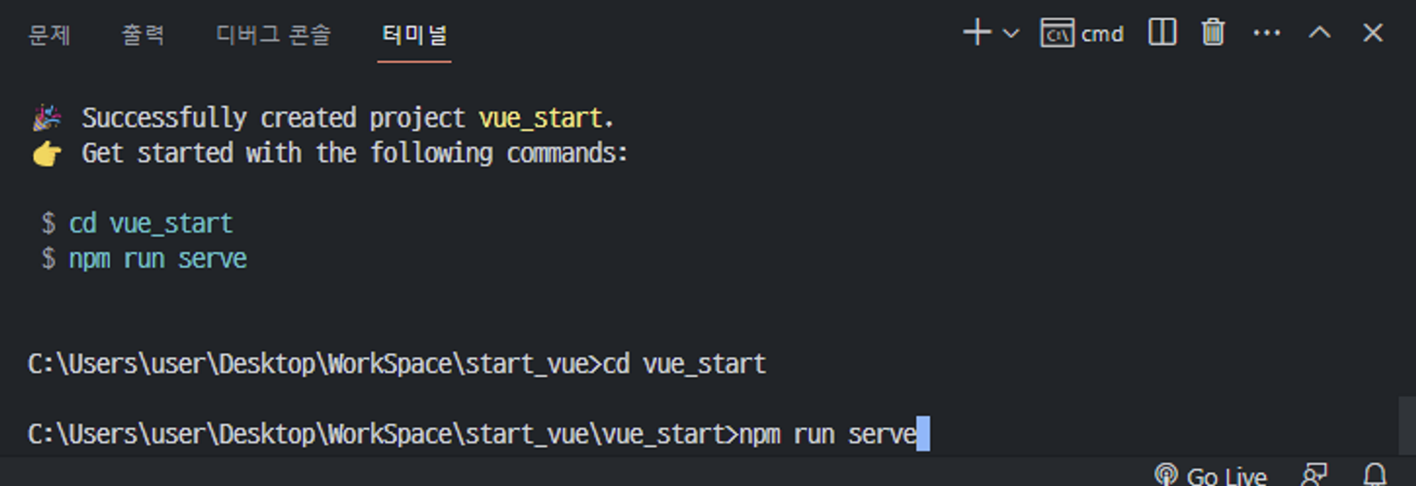 마지막으로 cd <프로젝트명> 으로 해당 프로젝트로 이동하고, npm run serve 명령어로 서버를 실행시키면 완료입니다.