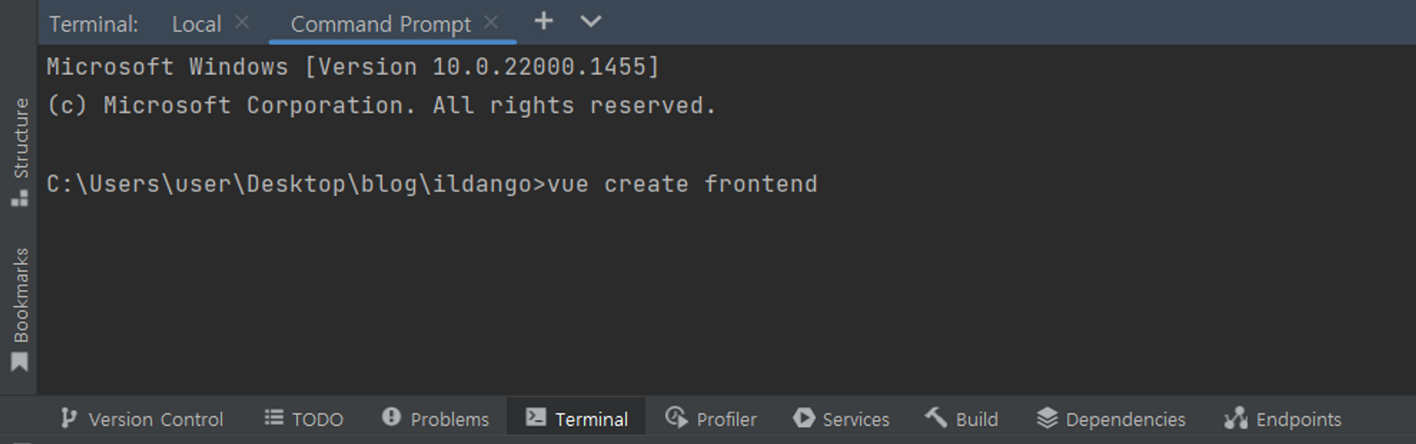 Vue.js 프로젝트를 생성하기 위해 Springboot 프로젝트의 최상위 폴더에서 vue create <vue 프로젝트명>을 입력합니다.