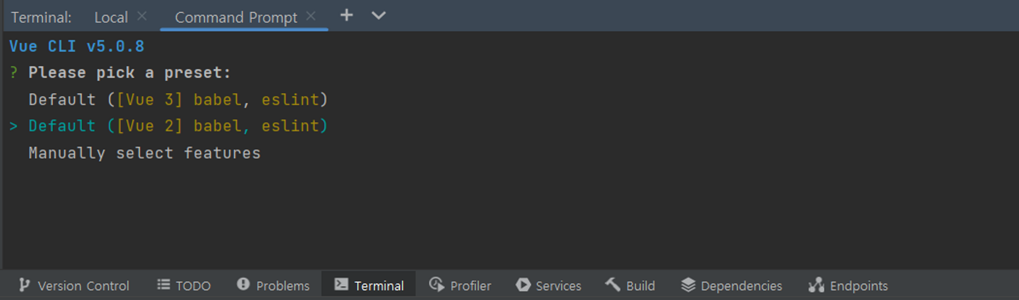 그러면 Vue 옵션을 선택할 수 있는데, 저는 Default ([Vue 2])를 선택할게요.