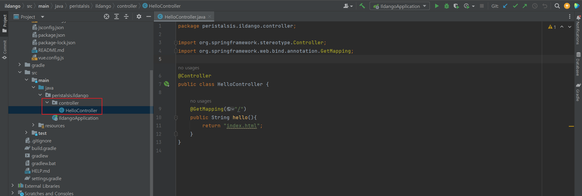 src/main/java/peristalsis.ildango아래에 controller 패키지를 생성하고, controller 패키지 안에 HelloController 클래스를 아래와 같이 생성합니다.