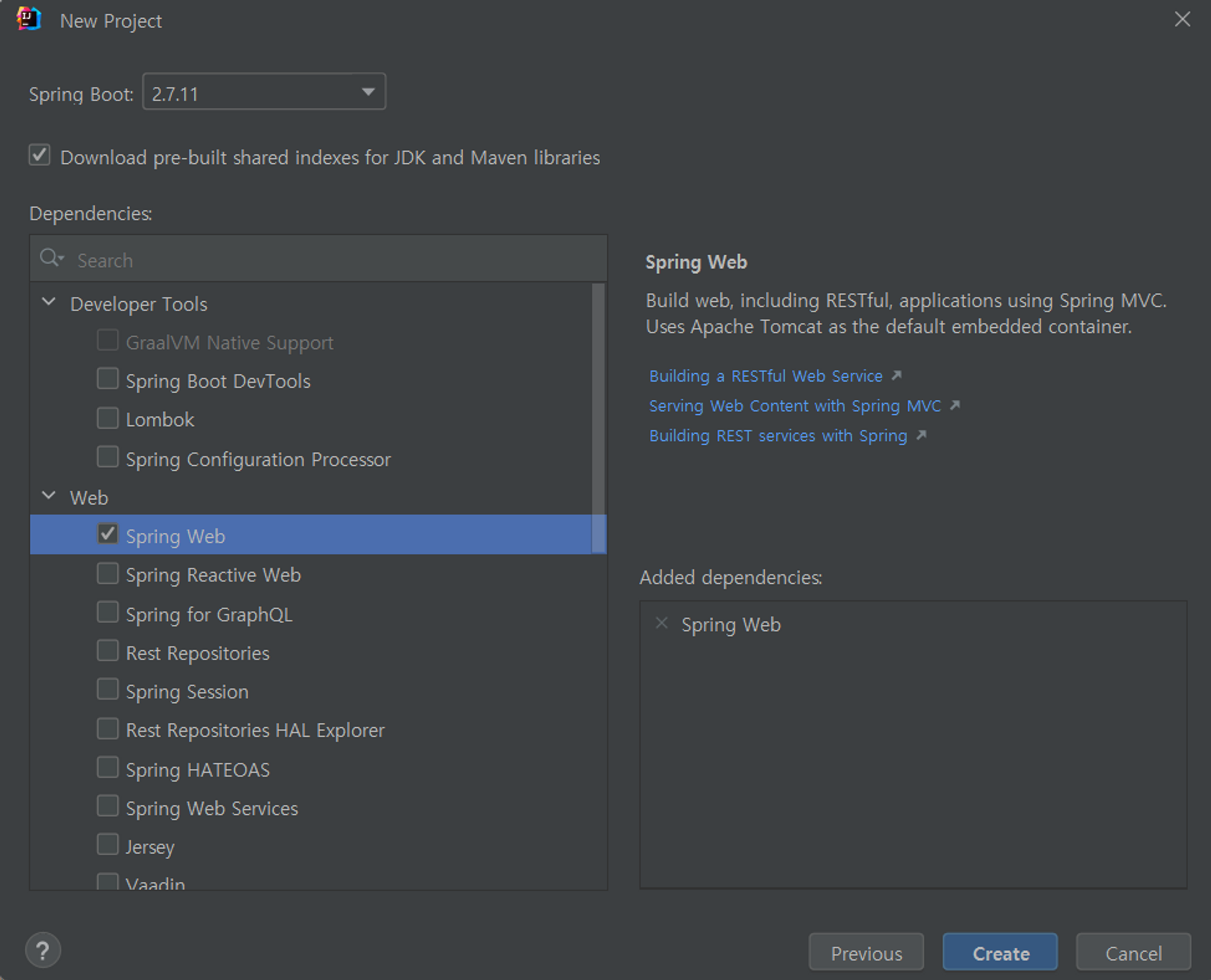 Dependencies는 간단하게 Spring Web만 추가할게요.