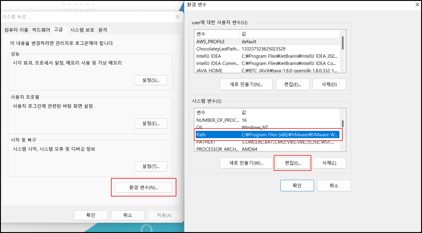 - 고급 시스템 설정 → 환경변수 → 시스템 변수의 Path 선택 → 편집
