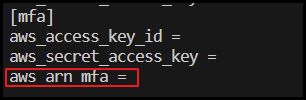 - cat ~/.aws/config --profile mfa