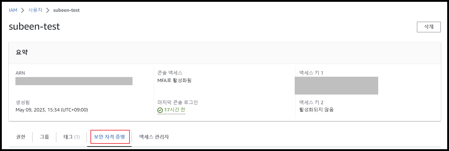 - subeen-test → 보안자격증명 → 사용자 액세스키 발급