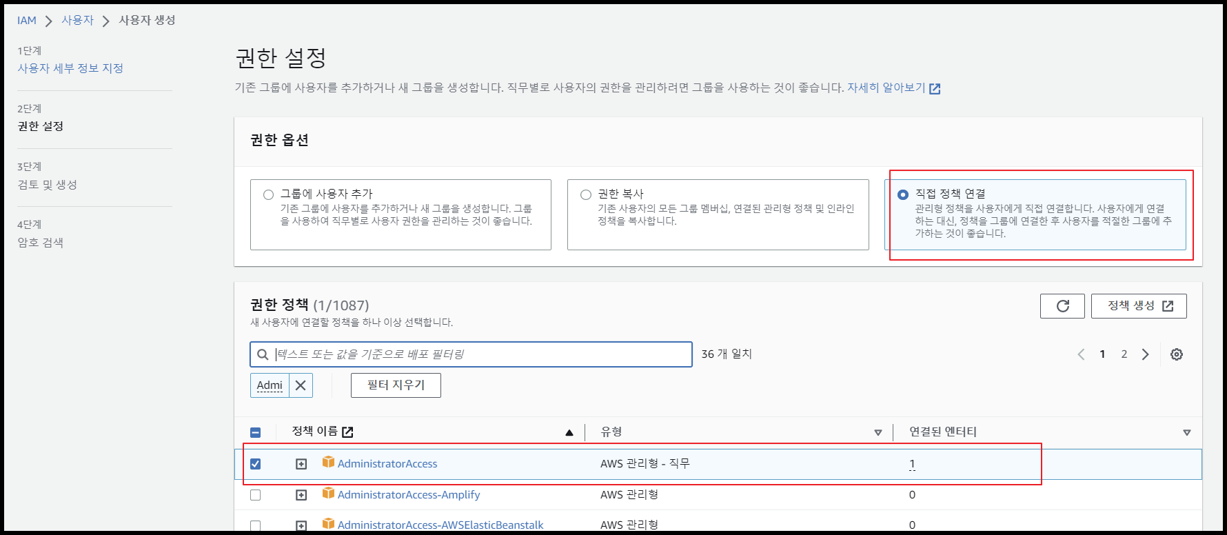 - 권한 설정 → 직접 정책 연결 → AdministratorAccess