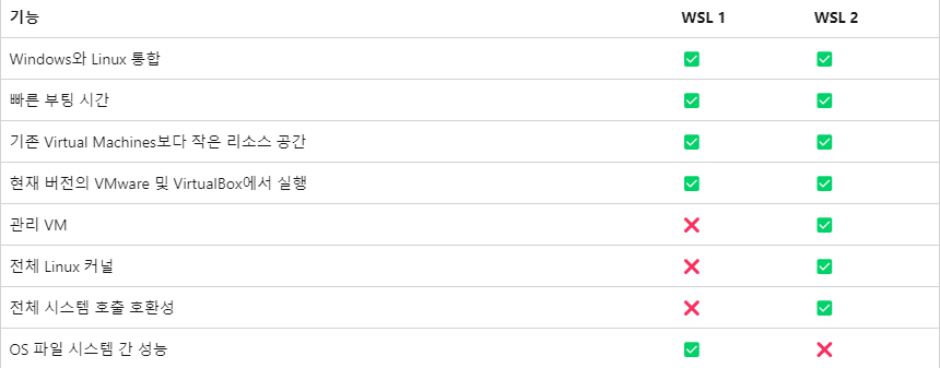 결과적으로 WSL2는 WSL1보다 실제 Linux 커널, 전체 시스템 호출 기능, 소켓/네트워킹 성능, 파일 시스템 성능 등이 더 좋아 졌습니다.