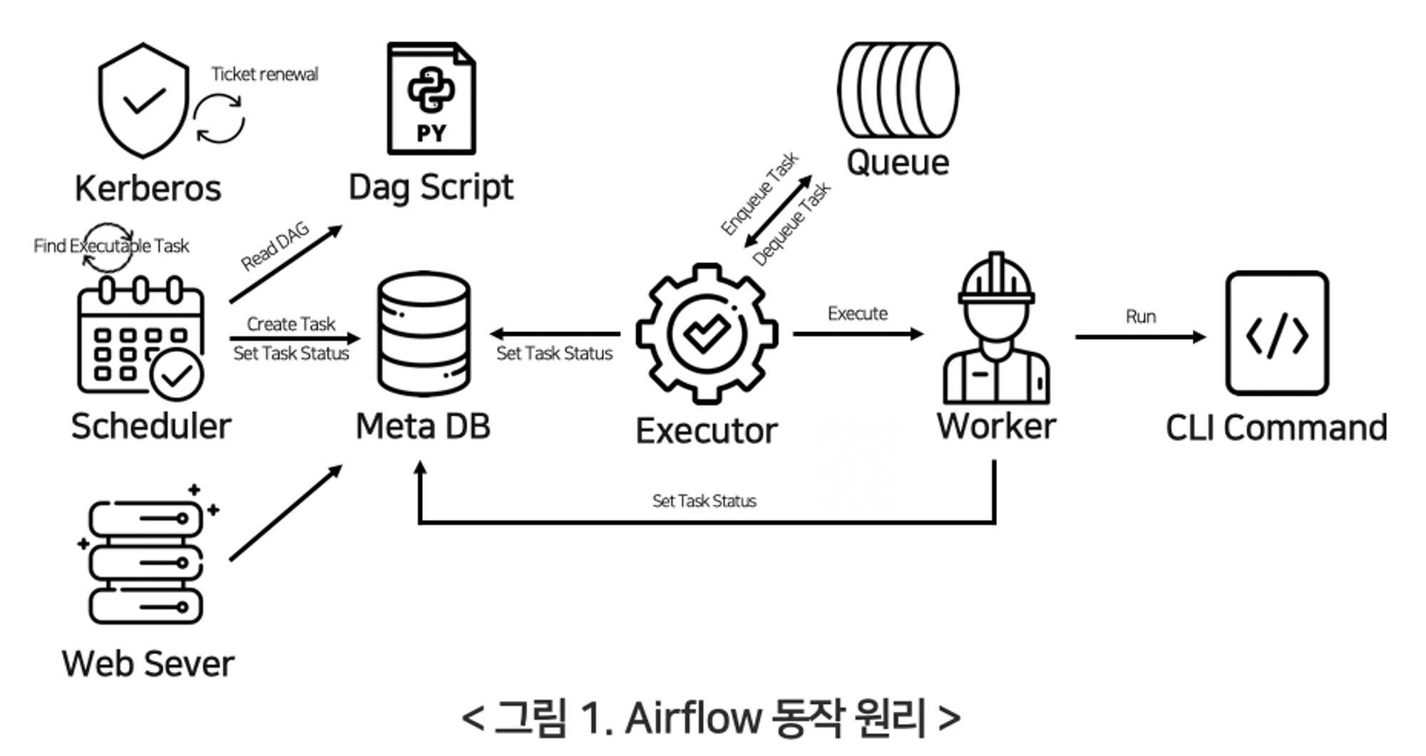 - 찾은 큐를 워커에서 실행하고, 실행후 나온 로그들을 회수합니다. 이 로그들은 Metastore(Airflow DB)에 저장되고 저장된 로그들은 웹 서버를 통해 확인할 수 있습니다.