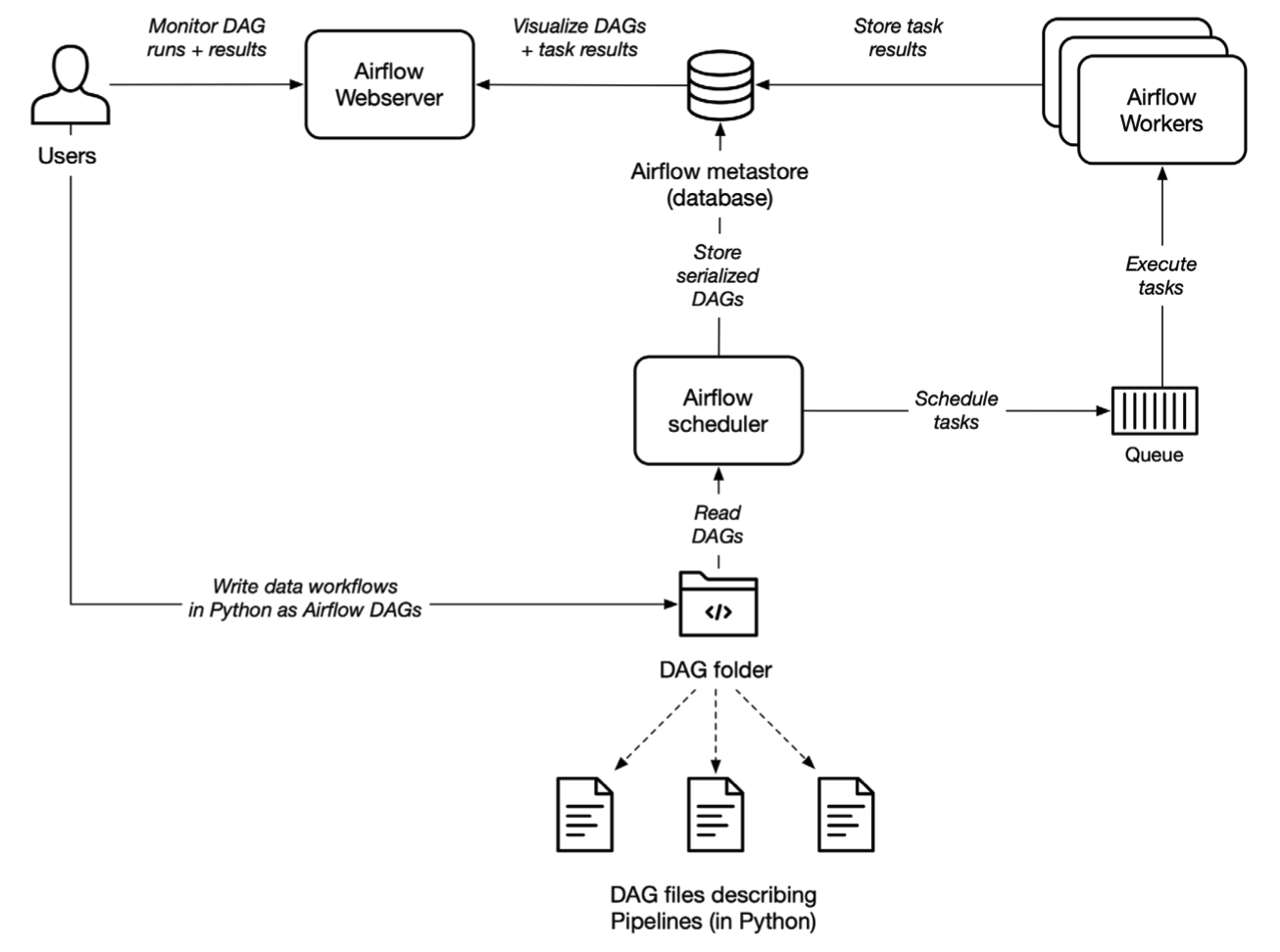 - Webserver 구동 -> DAGs 에서 .py 파일을 받아와서 보여줌 -> Scheduler에서 DAGs를 보고 메타스토어에 정보를 전달 -> DAGRun 생성 -> DAGRun에 해당하는 Task Instance 생성 및 Excutor에 전달 -> Task가 여러개면 메타스토어와 Task 들의 처리 상태를 업데이트 -> Task가 완료되면 DAGRun에 상태 보고 -> Scheduler에 완료 상태 업데이트