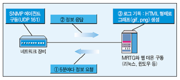 모니터링 대상인 네트워크 장비에는 MRTG 서버의 SNMP 요청에 응답하기 위한 에이전트(Agent)를 구동시키고,