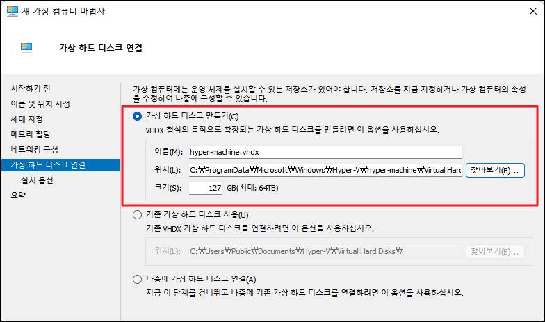 가상 하드디스크의 이름과 위치, 그리고 크기를 선택합니다.