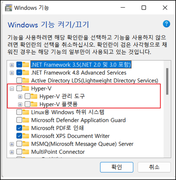비활성화되어 있는 HYPER-V 기능을 찾아 체크해준 후 확인 버튼을 클릭합니다.