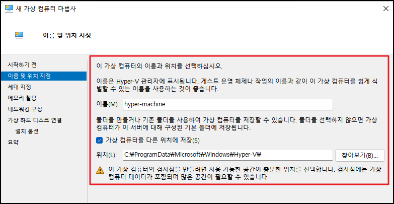 가상 컴퓨터의 이름과 충분한 용량의 여유가 있는 하드디스크의 위치를 선택해줍니다.