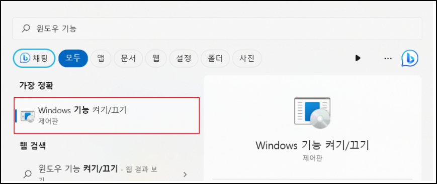 윈도우 키를 누른다음 한글로 윈도우 기능을 입력하여 Windows 기능 켜기 / 끄기를 클릭합니다.