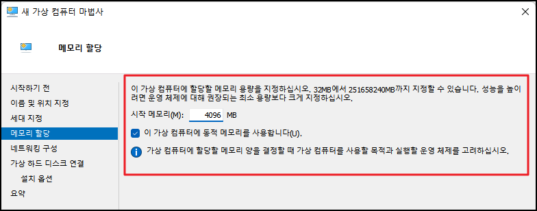 가상 컴퓨터에 할당할 메모리 용량을 지정합니다.