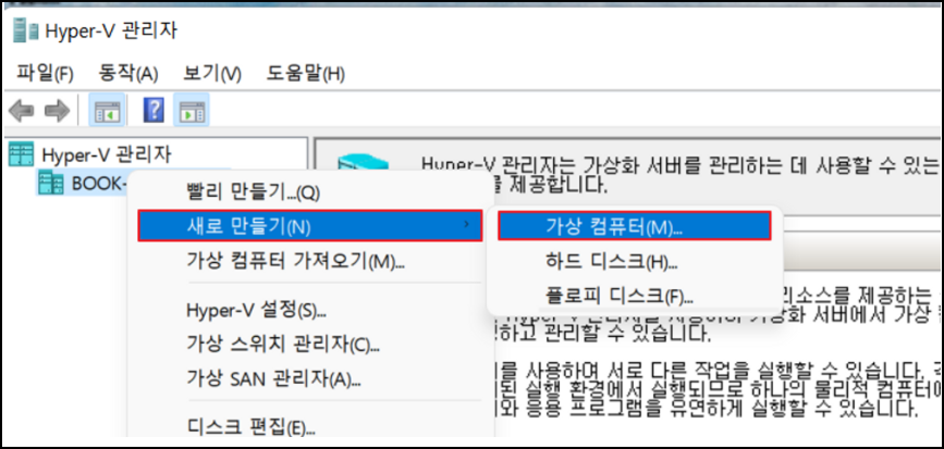 새로 만들기 > 가상 컴퓨터 를 선택합니다.
