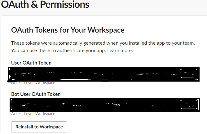 해당 페이지에서 OAuth Tokens for Your Workspace 블록에서 Install to Workspace 버튼을 클릭해주세요.