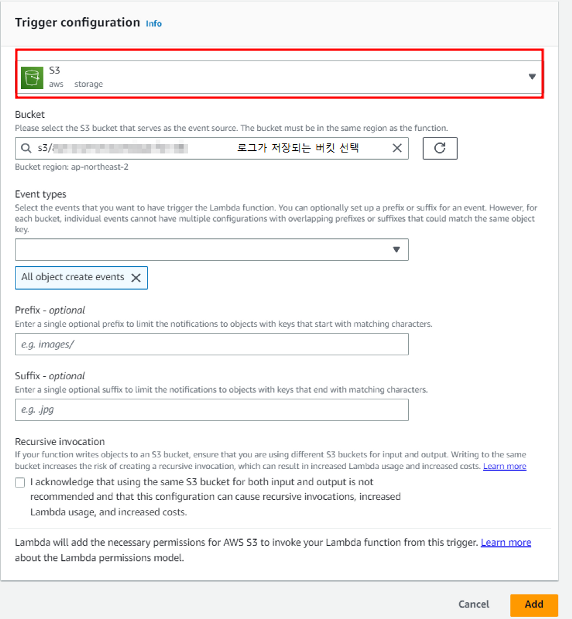 위와 같이 트리거가 생성되면 s3에 로그가 저장될 때 마다 람다함수를 호출하여 해당 로그를 cloudwatch 로그그룹으로 전송합니다.