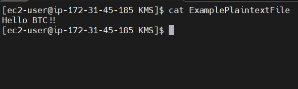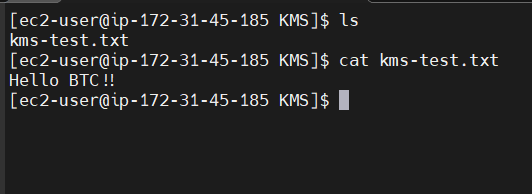 복호화된 ExamplePlaintextFile의 내용을 확인 해보면 kms-test.txt파일의 내용인 Hello BTC!!와 동일 한 것을 확인 할 수 있습니다.