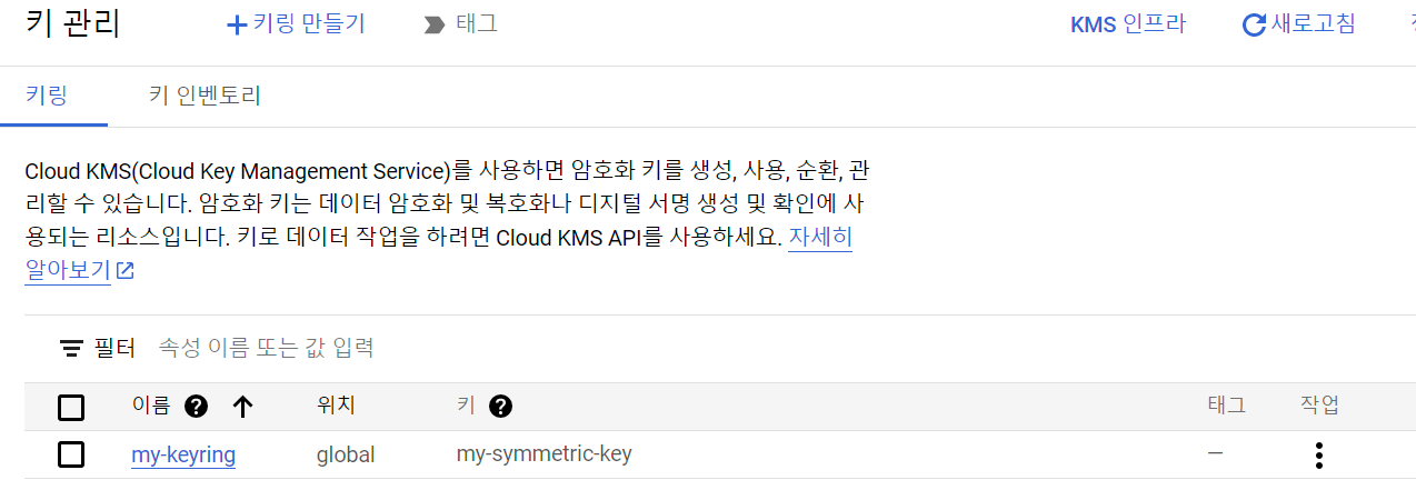 영역에 이름이 지정된 키 링을 만듭니다.my-keyringglobal ##특정 지역으로 설정할 수도 있습니다