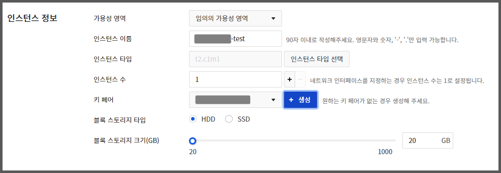( ※ 다운로드 받은 키페어 .pem 파일은 인스턴스 접속시 필요하므로 다운받아둔 위치를 확인하시고, 삭제하시면 안됩니다. ) - 블록 스토리지 타입 및 크기도 필요에 따라 조절해줍니다.