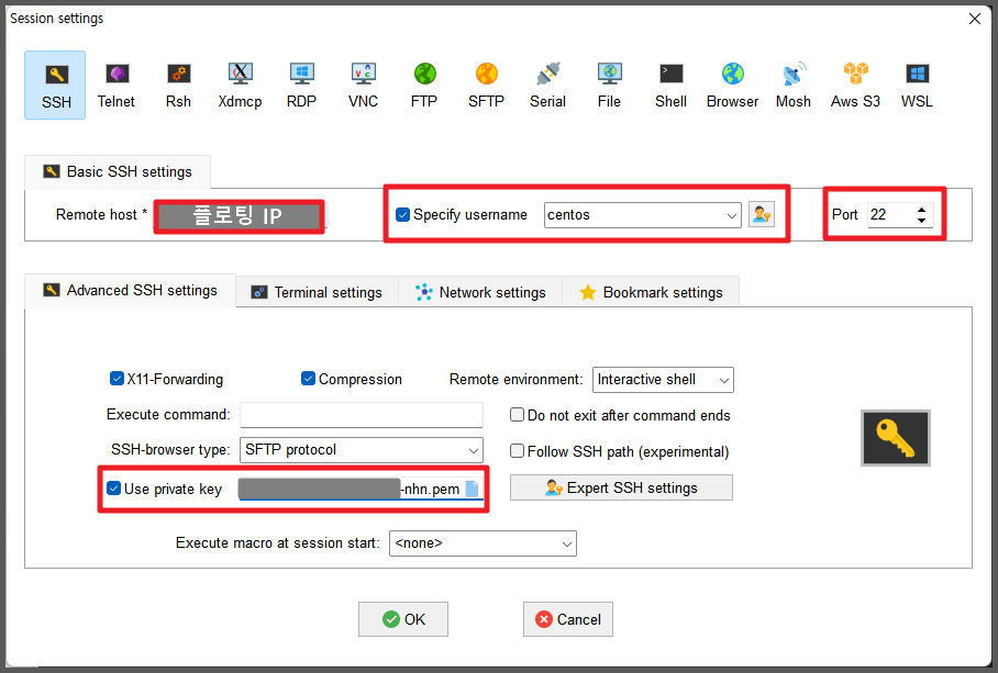 (저는 MobaXterm을 사용하였으나 본인에게 편하신 프로그램을 이용하면 됩니다)- Remote host : 인스턴스 목록에서 확인한 플로팅 IP 주소를 입력합니다.