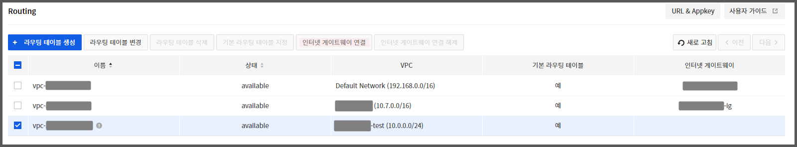 - 라우팅 테이블이 생성된 후 목록 상단의 인터넷 게이트웨이 연결을 선택합니다