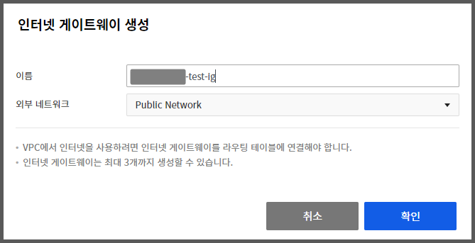 - Network - Internet Gateway - 인터넷 게이트웨이 생성 을 선택하여 생성합니다.