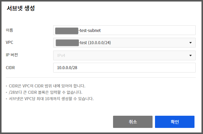저는 테스트 목적이기 때문에 CIDR를 최소로 잡았습니다. )