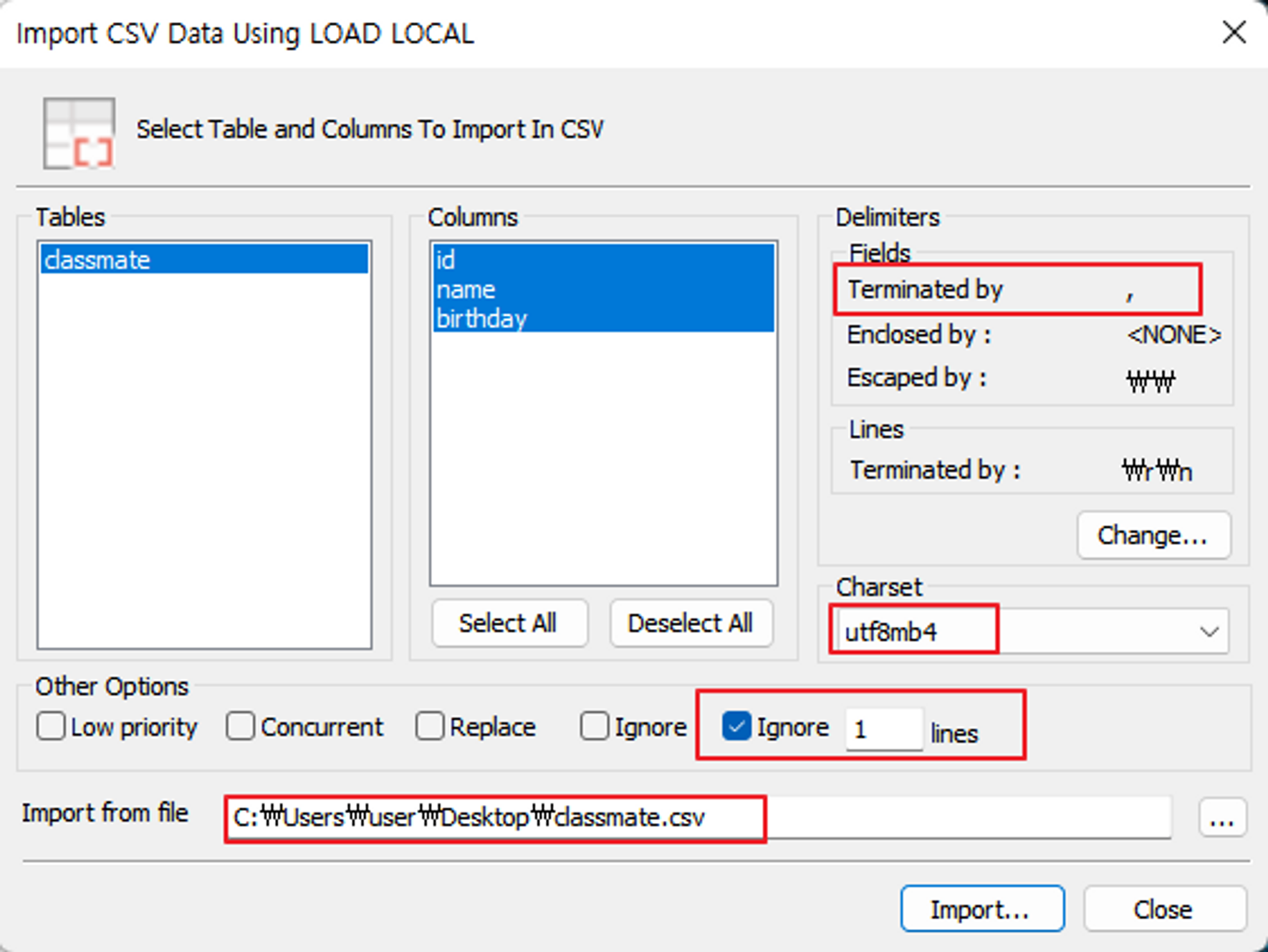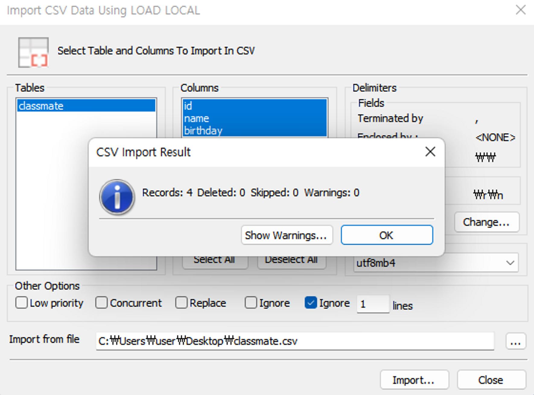 마지막으로 csv 파일의 첫번째 줄은 필요없으므로 Ignore 지정을 해주고 Import 해줍니다.