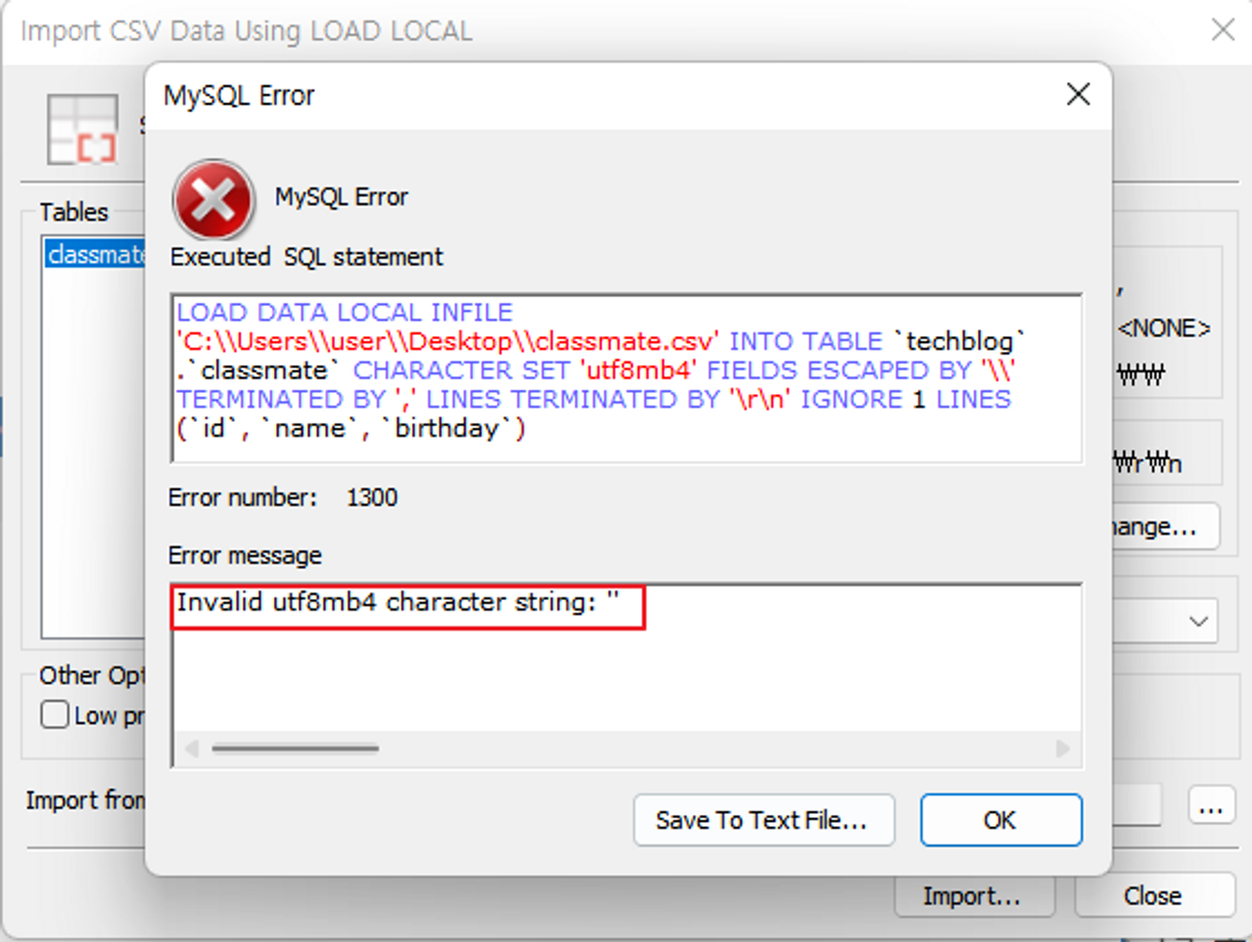 Import할 때 인코딩 방식을 utf8로 지정했는데, 파일의 인코딩 방식이 달라서 뜨는 에러입니다.