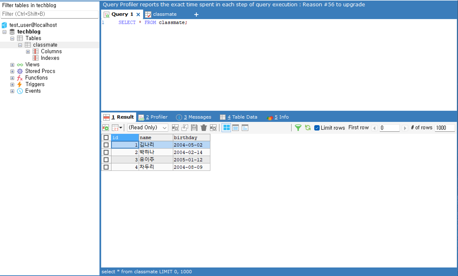 SELECT문을 통해 테이블을 확인해보니, 데이터가 잘 들어간 것을 확인할 수 있습니다.