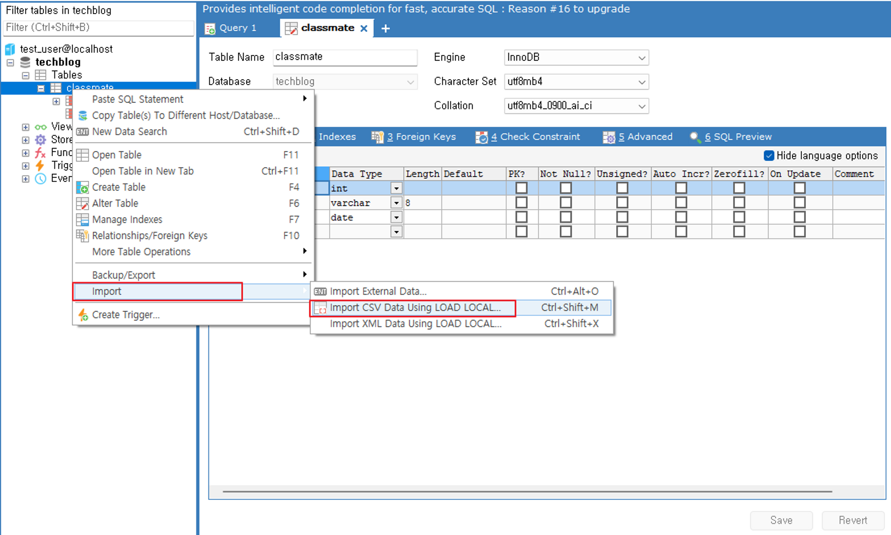 데이터를 넣고싶은 테이블에서 마우스 우클릭 - Import - Import CSV Data Using … 을 눌러줍니다.