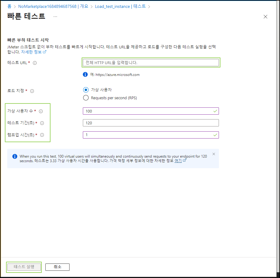 - 가상 사용자 수, 테스트 기간, 램프업 시간을 설정 해준 후