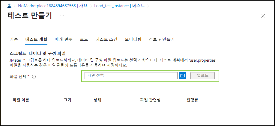 이후에 검토+만들기를 통해서 JMeter 스크립트 업로드 방식으로 테스트를 생성할 수 있어요.