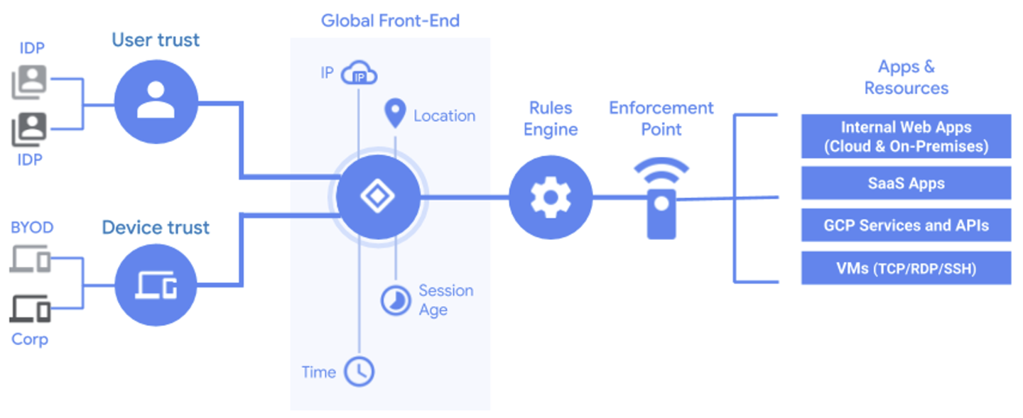 BeyondCorp Enterprise는 4가지 Google Cloud 서비스를 활용하여 작동합니다.
