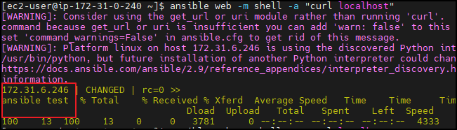 ansible web -m shell -a "curl localhost"