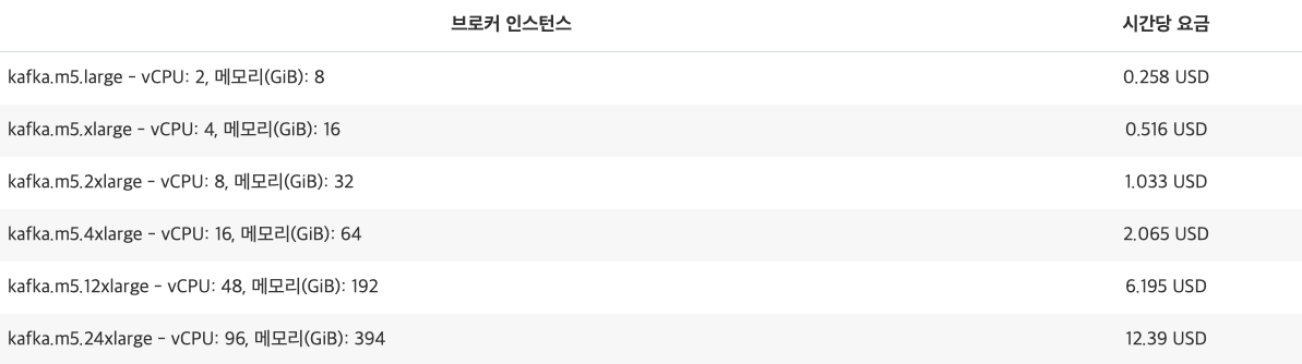 - 브로커 인스턴스 요금 : 아래 표 참조