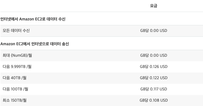 - 데이터 전송 요금 : 표준 AWS 데이터 전송요금으로 환산됩니다. 아래 표 참조