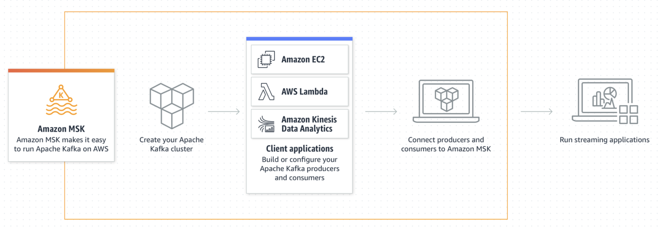 프로듀서 및 컨슈머 — Amazon MSK를 사용하면 Apache Kafka 데이터 영역 작업을 사용하여 주제를 만들고, 데이터를 생성 및 소비할 수 있습니다.